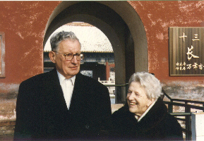 De twee oudste orkestleden, Hans de Vries en Riek van de Donk weerstaan de kou in de Verboden Stad in Beijing.