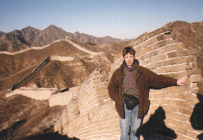 Pim Muijselaar rust uit na talloze treden van de Chinese Muur te hebben bedwongen.