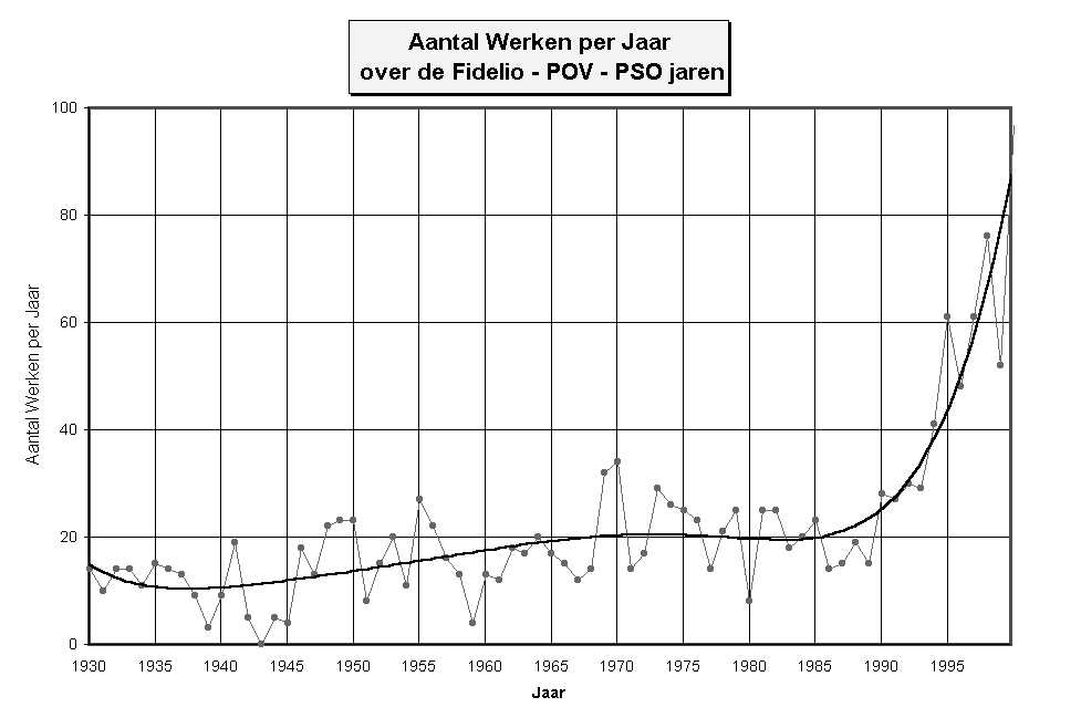 Het eerste grafiekje geeft het aantal concerten per jaar van ons orkest weer. Je ziet dat dit in de beginjaren kabbelt tussen de 1 en de 5 per jaar. Hierbij dient wel te worden vermeld dat de leden van het toenmalige Fidelio nogal vaak in andere ensembles speelden, tot zelfs een afsplitsend (niet meer bestaand) orkest toe: Het Nieuw Eindhovensch Orkest. Ook werden veel kamerconcerten gegeven in een iets grotere bezetting en gecombineerd met andere ensembles. Wanneer dit niet onder de Fidelio-vlag ging zijn deze uiteraard niet meegeteld. Vaak is het echter zeer moeilijk te traceren of deze concertjes wel of niet onder de naam Fidelio uitgevoerd werden. Ook wanneer er gecombineerde concerten gespeeld zijn met andere ensembles, dan zijn alleen de Fidelio-werken geteld.