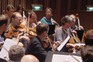De PSO eerste violen sectie geconcentreerd aan het werk.