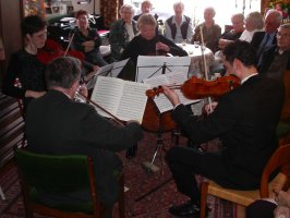 Een afvaardiging van het orkest kwam ook spelen. Hier wijst Riek aan Carol en zijn vrouw welke bezoekers ze opzij mogen schuiven om plaats te maken voor het PSO kwartet.