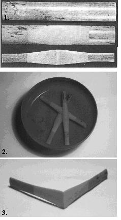 Laten we bij het begin beginnen. Riet groeit als ronde pijpen. Om hiervan uiteindelijk het goede beginmateriaal van te maken moeten deze pijpen gespleten worden in de lengterichting, van de binnenkant uitgegutst en op de juiste lengte worden gesneden en dan hebben we een plaatje riet zoals in figuur 1 (bovenste). Dat plaatje wordt dan geprofileerd (middelste) en gemodelleerd, totdat een plaatje is ontstaan als in figuur 1 (onderste). Er zijn trouwens allerlei mallen mogelijk om het riet in model te snijden en allerlei diktes mogelijk waarmee het profiel van het riet wordt gemaakt, maar hier zullen we maar niet op ingaan. Zo’n rietplaatje leggen we dan een dagje in het water (figuur 2), en daarna is het zacht genoeg om het te kunnen ombuigen (figuur 3). Omdat het rietje later op de Es, die zilveren buis waarmee de fagot begint, moet passen, moet de achterkant van het riet nogal van vorm veranderen om een mooie ronde opening te vormen. Dit gaat als volgt: het riet wordt van achteren strak omwikkeld met een natte katoenen draad, tot helemaal over het riet blad (figuren 4 en 5).