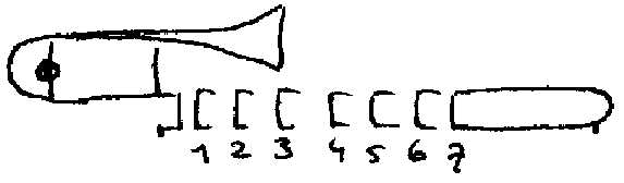 Naast de grondtoon kun je op een trombone ook boventonen spelen. Dit principe is te vergelijken met de flageoletten op een vioolsnaar (zie VHV mei 1999, blz 6). De frequenties van deze boventonen zijn veelvouden van de grondtoon (2x, 3x, 4x etc.). Dit resulteert in de tonen bes, f, bes, d, f, gis (onzuiver (!)), bes etc. De ontbrekende tonen zijn te vormen door artificieel de buislengte te verlengen met een zogenaamde schuif (vandaar de naam schuiftrombone). Oplettende lezertjes onder ons hebben natuurlijk al uitgerekend dat zo’n schuif 6 halve-toons afstanden moet kunnen overbruggen om het gehele bereik af te kunnen dekken. Deze standen (tezamen met de stand dat de schuif geheel ingeschoven is) worden de 7 posities genoemd. Onderstaand plaatje (dat meer weg heeft van een uit-zijn-krachten-gegroeide-paperclip) verduidelijkt dit: