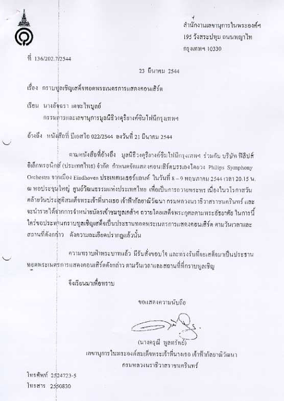 Rajanagarindra haar komst naar het PSO concert bevestigt. (Brief is in Thais, in JPG-format).