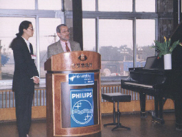 Voorzitter Rien Frankenhuis geeft, bijgestaand door een tolk, een persconferentie voor de Chinese pers.