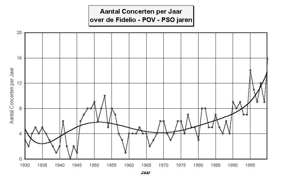 Het eerste grafiekje geeft het aantal concerten per jaar van ons orkest weer. Je ziet dat dit in de beginjaren kabbelt tussen de 1 en de 5 per jaar. Hierbij dient wel te worden vermeld dat de leden van het toenmalige Fidelio nogal vaak in andere ensembles speelden, tot zelfs een afsplitsend (niet meer bestaand) orkest toe: Het Nieuw Eindhovensch Orkest. Ook werden veel kamerconcerten gegeven in een iets grotere bezetting en gecombineerd met andere ensembles. Wanneer dit niet onder de Fidelio-vlag ging zijn deze uiteraard niet meegeteld. Vaak is het echter zeer moeilijk te traceren of deze concertjes wel of niet onder de naam Fidelio uitgevoerd werden. Ook wanneer er gecombineerde concerten gespeeld zijn met andere ensembles, dan zijn alleen de Fidelio-werken geteld.