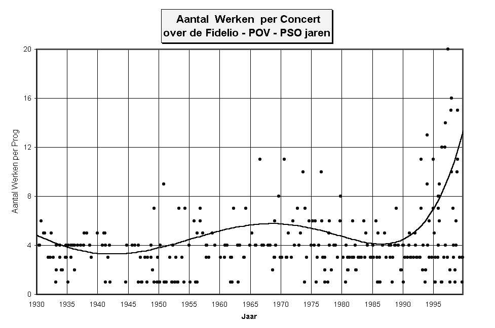Totaal aal aantal concerten per jaar Het is dan ook duidelijk zichtbaar. Het meest illustratief hiervoor is de derde grafiek van het totaal aantal gespeelde werken per jaar. Hierin zijn alle verdubbelingen meegeteld. Na een vrij kabbelend bestaan over ca. 60 jaar is die traditie de afgelopen 10 jaar duidelijk gebroken.