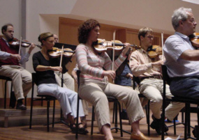 De PSO eerste violen sectie geconcentreerd aan het werk.