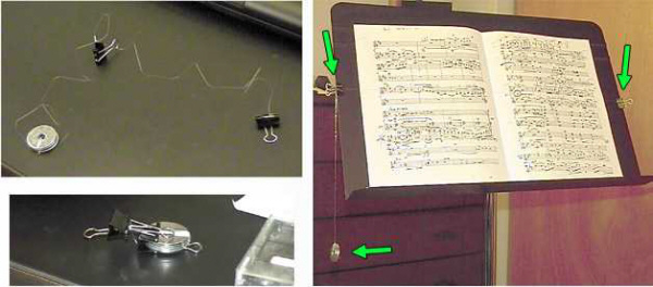 Ingrediënten zijn twee papier-klemmen (die je kunt 'lenen' van elk kantoor), een gewichtje en een stuk visdraad. Aan het ene uiteinde van de visdraad maak je het gewichtje vast, aan het andere uiteinde een klemmetje. Het tweede klemmetje rijg je halverwege aan de visdraad. Bevestig de klemmetjes aan weerszijden van je lessenaar zoals getoond op de foto. De visdraad loopt haast onzichtbaar over de bladmuziek.