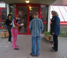 Tussen de repetities gaan rokers snel naar buiten...