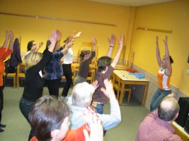 Aan het eind van de middag repetitie organiseert Chantal een aerobics klas, speciaal voor alle orkestleden met vermoeide ruggen en vastzittende spieren.