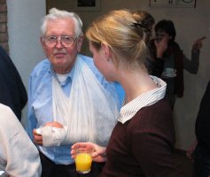 Bert Strijks was ook van de partij. Hij kan met zoveel gips geen viool spelen, maar was ingeschakeld als slagwerker.