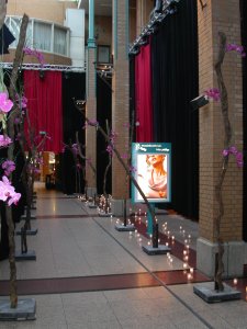 Opnieuw was het Muziekcentrum schitterend aangekleed met paarse orchideen. Hier de ingang (rechts normaal de kassa's).